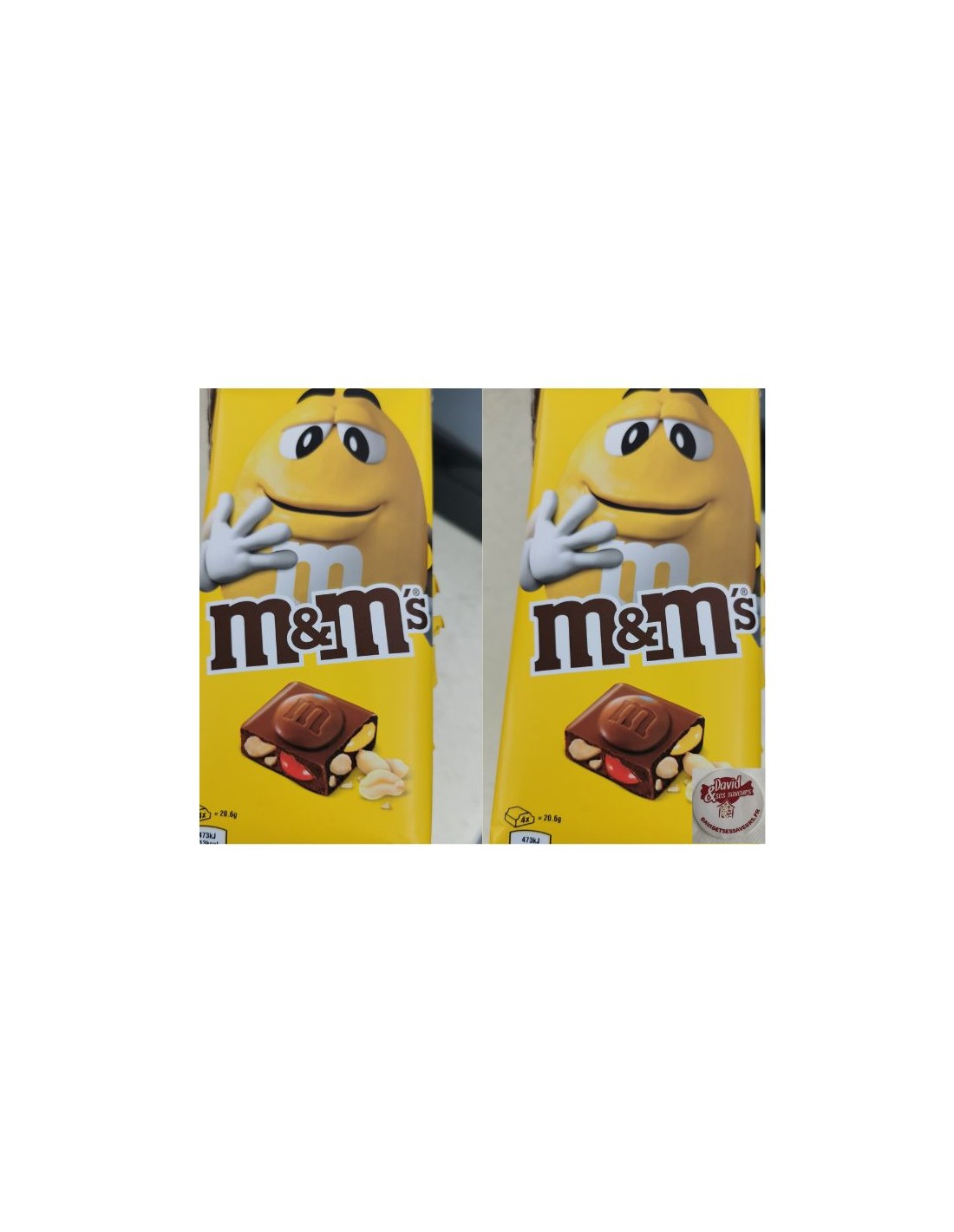 Chocolat au lait avec M&M’S mini (7,5%), chocolat au lait enrobé dans une coque en sucre colorée et éclats de cacahuètes (7,6%). Ingrédients : Sucre, beurre de cacao, lait écrémé en poudre, pâte de cacao, cacahuète, matière grasse du lait, lactose, perméat de lactosérum (lait), lait entier en poudre, émulsifiant : Lécithine de soja, matière grasse de palme, amidon, sirop de glucose, matière grasse de karité, stabilisant : Gomme arabique, colorants* : Dextrine, extrait de vanille, agent d’enrobage : Cire de carnauba, huile de palmiste, sel, arôme. Peut contenir : Amandes, noisette, blé, cacao 25% minimum * E100, E133, E160a, E162, E170, E172.