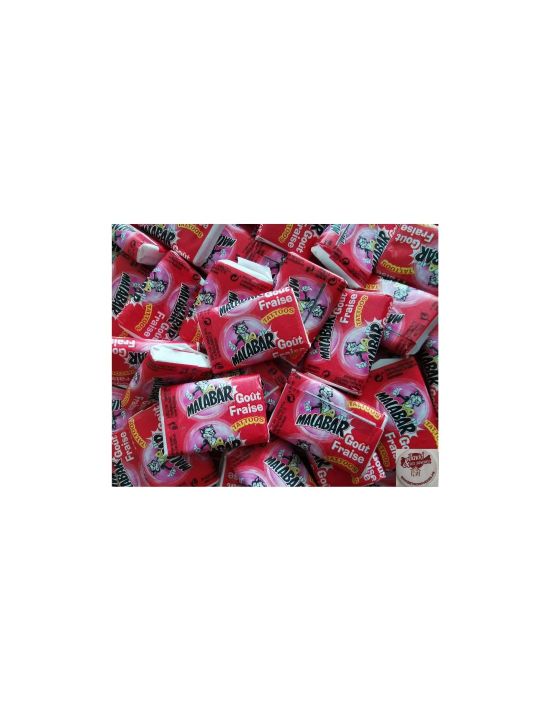 Pour commencer, le malabar est l’un des mythiques bonbons avec son légendaire tatouage. Il se présente sous forme rectangulaire de gomme à mâcher.