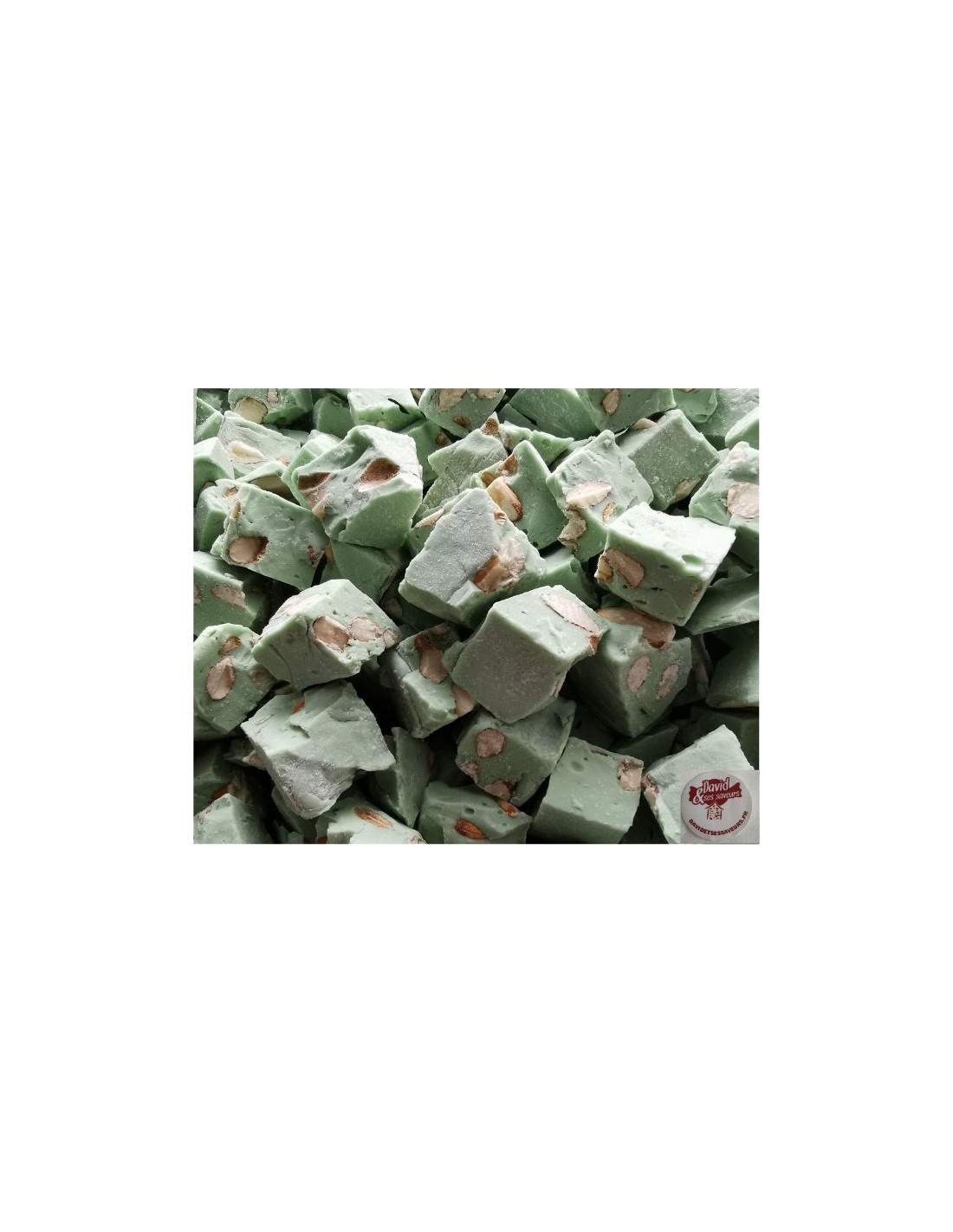 Ingrédients : Sucre, sirop de glucose (sulfites), amandes (15%), poudre de blanc d’œuf, protéines de lait, arôme, colorant : Chlorophylline cuivrique.