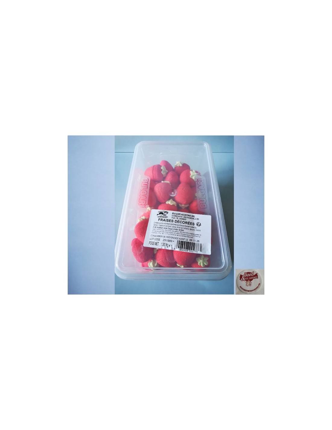Pour commencer, la confiserie italienne Bulgari, est une magnifique et délicieuse tradition de marshmallow avec le bonbon fraise, une douceur à la guimauve. Cette friandise en forme de fraise géante de 5 centimètres de long, conique, rouge avec une feuille verte qui vous fera craquer de gourmandise. C’est un bonbon de double texture très original qui plaira aux petits et aux grands. Venez la découvrir et n’hésitez pas à commander dès maintenant sur le site de la boutique en ligne : https://www.davidetsessaveurs.fr.